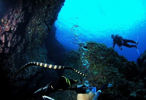 本来蛇是生长在陆上的爬虫类动物,怎么演化成以大海为秀场则有待专家解释,只知为了游泳方便尾部演化成扁平状以便于摇摆前进,呼吸构造也特别强化到可以一次换气在水里待2个小时,甚至皮肤也可分担5%的呼吸,从水中滤取空气。