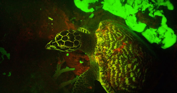 是的,这只海龟正散发绿色和红色的萤光。不,它不具放射性。