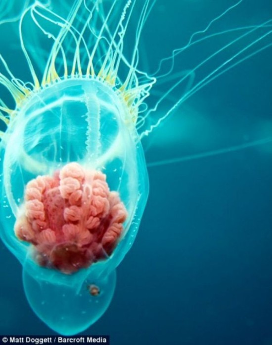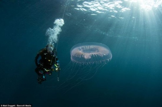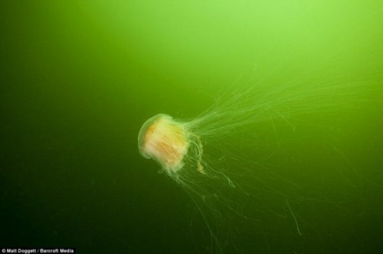 潜水员潜水时,拍摄到了隐藏在这片海域海底罕见的狮鬃水母。