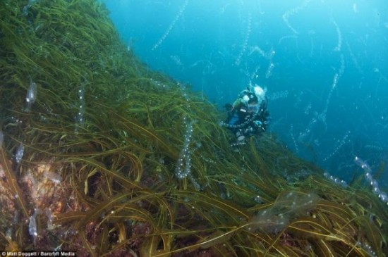 潜水员在Orkney Islands潜水时,不仅拍摄到了各种各样的水母,还拍摄到了海鞘。