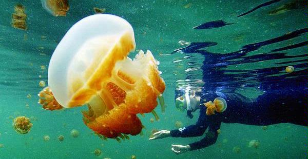 水母湖是一种由于特殊的地理条件而形成的特异的自然现象。现在湖里的生物除了每天来访的人类以外,主要就是这些水母和一些藻类了。更令人惊叹的是,这些通常令潜水人头皮发麻的水母全都丧失了毒性和攻击用的触须,成为一种非常可爱的生物。