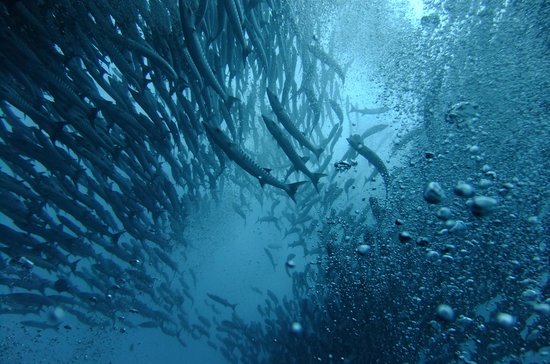 成千上万条鱼,有如龙卷风般在海底席卷而过,这就是“海狼风暴”。其实不用去诗巴丹,在达拉湾的马拉图拉岛(Maratua),就可以见到这样的海底奇观。它们是海底的猎人,却并不会主动攻击人类。一旦集体出动,哗——真是遮天蔽日,只有“暴风眼”里透出一束太阳的光亮。当然,回程时,你也可能会遇到几条海豚,让惊吓到的小心脏稍稍被治愈一下。