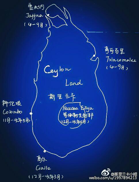 兰卡的季风季节、东边西边经常让人傻傻分不清楚。怎么办?@斯里兰卡小妞已经手绘了一张非常棒的图告诉大家最佳造访的季节(原文里说:手绘by 微博@斯里兰卡小妞,请不要嫌弃字丑,她已经尽力了╮(╯▽╰)╭,但我们觉得已经非常完美了,此处必须要有掌声)