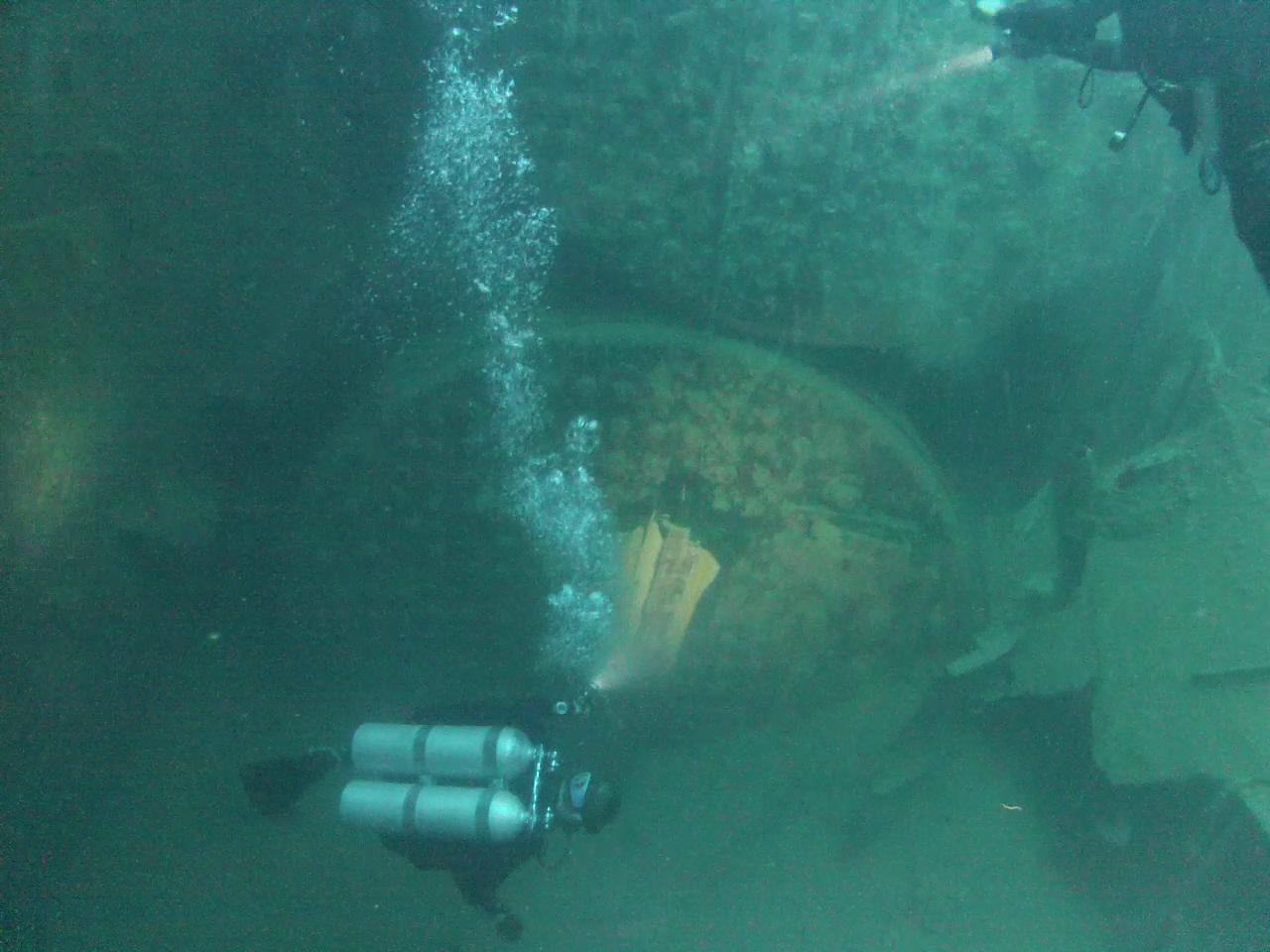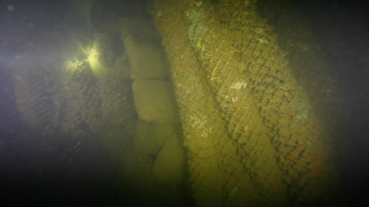Ekkai Maru侧卧在海底,左舷上有个巨大的从内向外的爆裂口,奇迹的是下方的锅炉房,还保存完好。