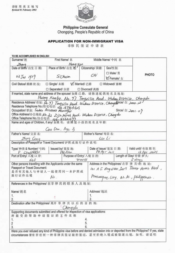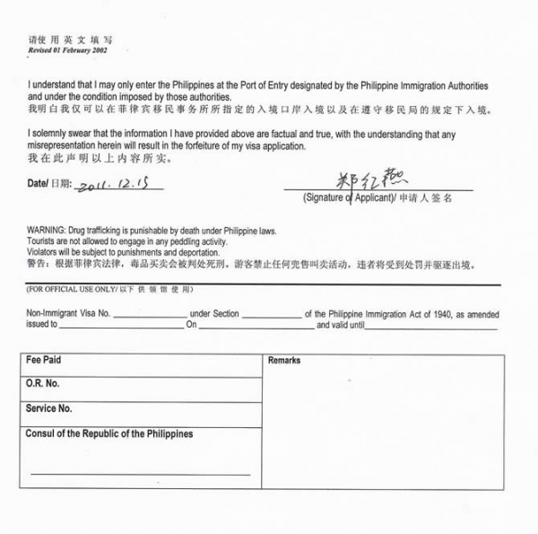 - 有效护照或旅行证件,有效期至少六个月以上,不包括允许在菲律宾的停留时间(复印护照资料页);