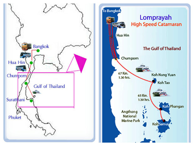 3)车船联程行程:通常先由曼谷搭大巴到达春蓬码头,再由春蓬码头转乘Lompraya快船到达涛岛。