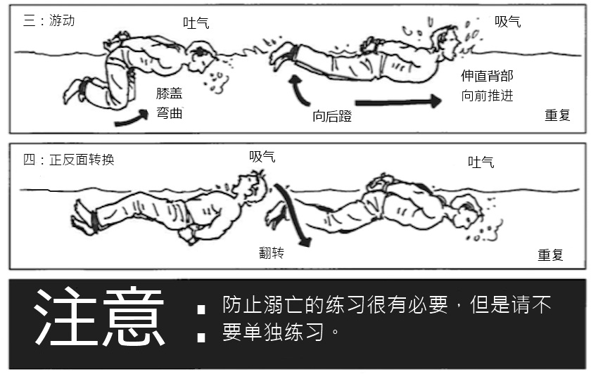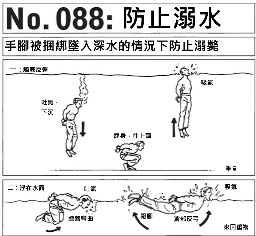 书中还提到,当你肺部充满空气时,身体自然容易浮起来,因此求生关键在呼吸。如果因为太紧张导致过度换气,可能会因为吸入的氧气不足导致失去求生机会。另外要避免单独练习,应有一名同伴在场,可防止突发状况。
