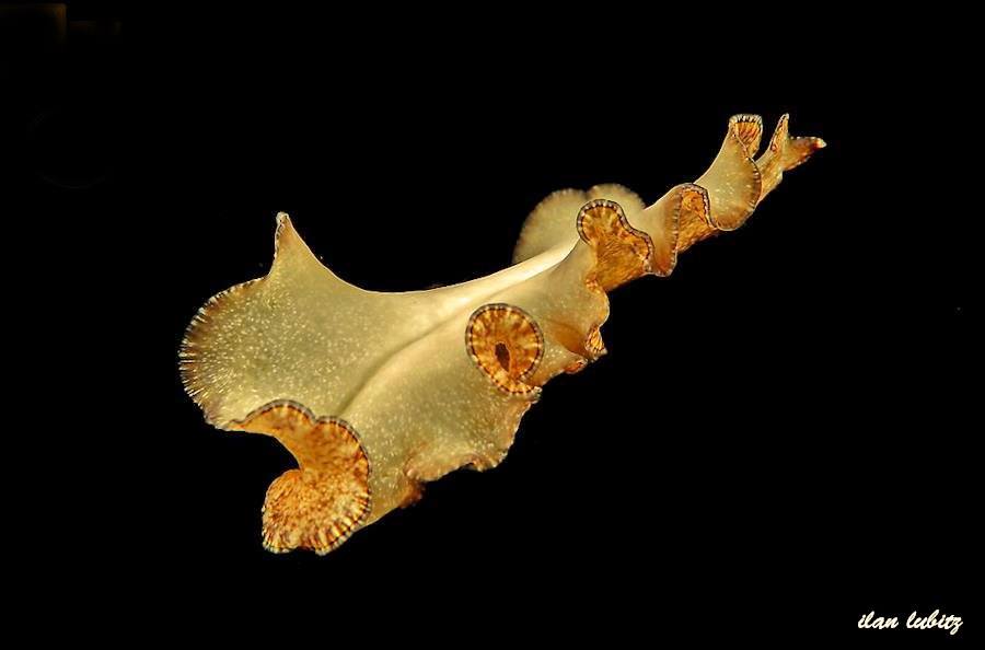 如果不是科学记录和突出背部的图案,切忌以高角度拍摄,这样的图片的可观性不高。有时可以单独拍摄它的尾部,通常海兔的尾部也是比较漂亮,也是一个很好的题材。