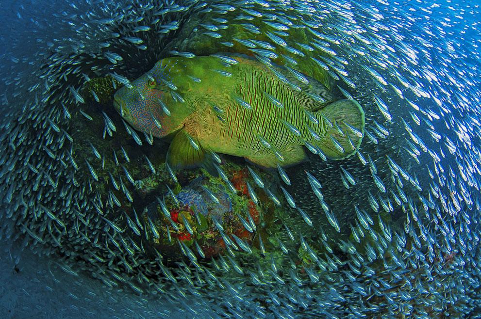 《自然类》提名奖。飓风刮过大堡礁最北部后的第二天,风仍然很大,我带了几个朋友去看珊瑚。在这种特别的珊瑚“礁”上我从来没有见过这么多的玻璃鱼。我就要拿起照相机,只见这条拿破仑濑鱼正好游过这些小鱼,构成了一个活的取景方框。(美国《国家地理》杂志摄影大赛/ Christian Miller)
