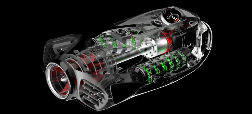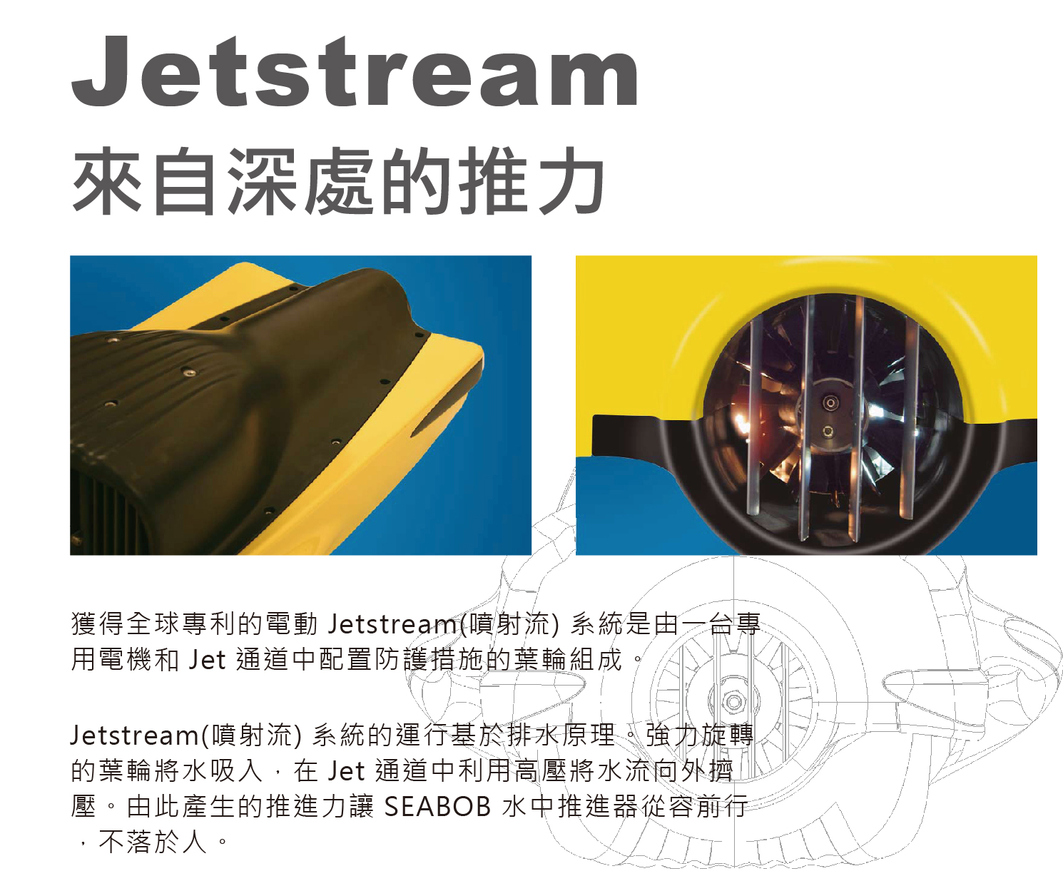 Seabob F7喷射器内置电动喷射系统已经申请了专利,它的工作原理是高速旋转的轮片吸水并按原路排出,高压迫使水体进入射流通道,它采用的电动机在射流通道里带有一个保护性运动轮片。