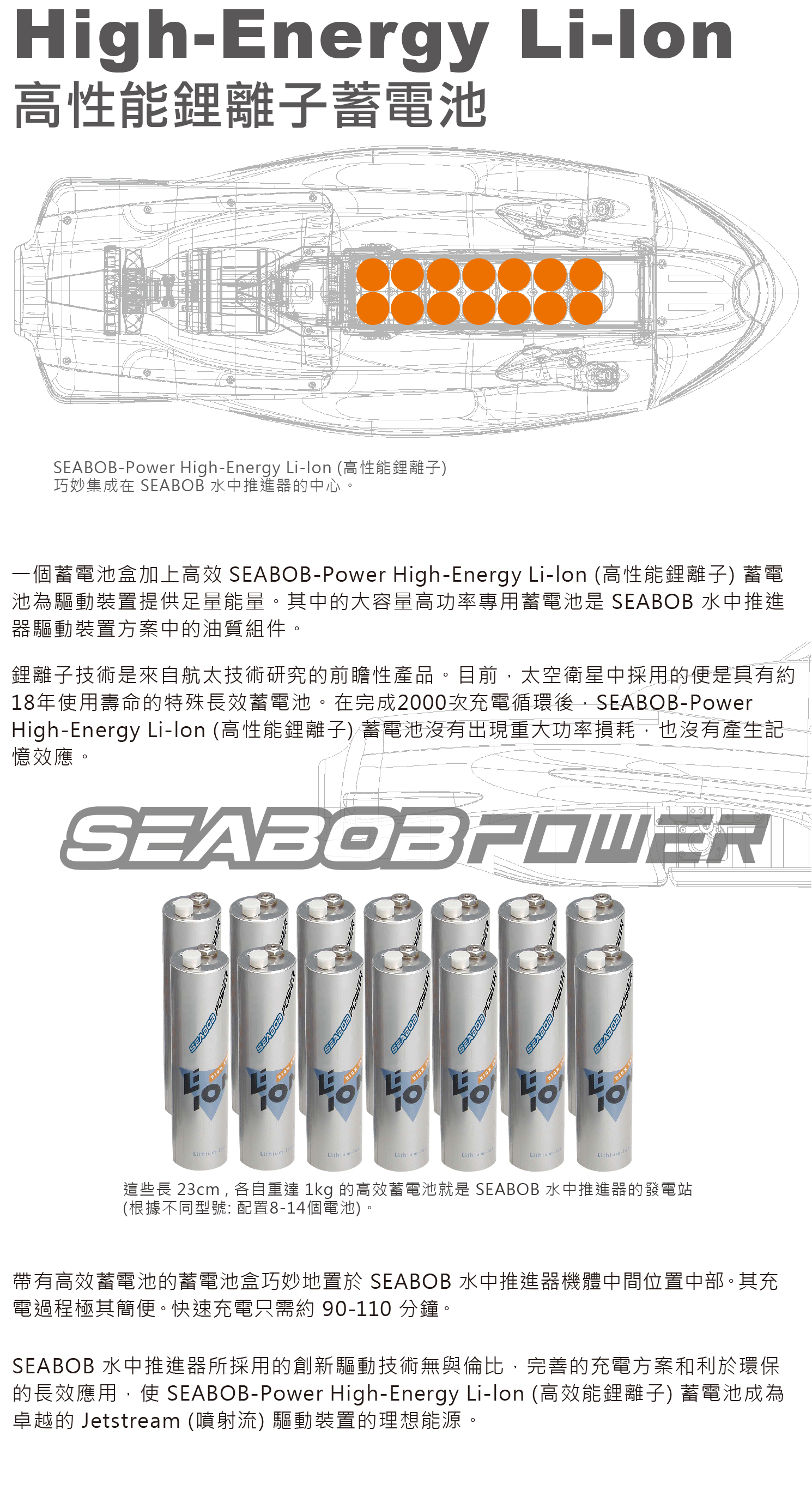 Seabob F7能够潜到水下40米深,可以持续运行60分钟,可以手动拍打10个转动装置来改变它的速度,潜水者运用体重来改变喷水器的倾斜角度来控制方向。它在水面的速度可达22公里每小时,在水中的速度也能达15公里每小时,整个喷水器重64公斤,在水中的浮力是8公斤。有蓝、银、红、橙、黄、白六种颜色,以及钛或铬合金供你选择。