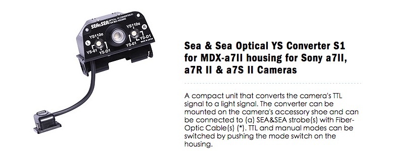 神器即将来临!索尼a7II、a7RII、a7SII专用光学TTL转换器,产品编号:#50139 OPTICAL YS CONVERTER/S1 FOR HOUSING MDX-A7II SEASEA 防水壳内置专用的C1/N1型YS光学TTL转换器优势: 1)相对于内置闪光灯,回电时间可以和外置闪光灯时间同步,实现高速