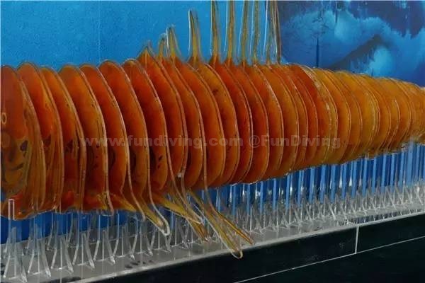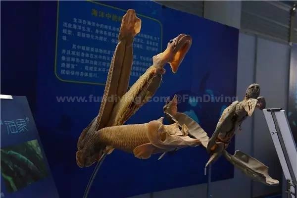 展览中,参观者还可以了解依赖海洋而生的硬骨鱼、软骨鱼、爬行类、鸟类和哺乳类、甲壳和软体动物的习性和结构特征,还可以看到憨态可掬的翻车鱼、长度超过5米的鲸鲨、霸气威猛的海象等形态各异的海洋生物标本。
