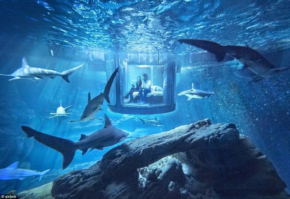 图为游客参观了水族馆以后在水下卧室用餐,同时几十头鲨鱼在他们头顶游弋。