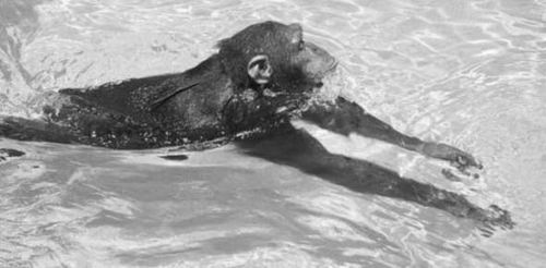 同被圈养的一只名叫Cooper的黑猩猩和一只名叫Suryia的红毛猩猩定期在浴缸和游泳池中活动,它们出乎意料地习得了水下技能。在安全绳确保安全的前提下,在一段日子里,Cooper变得越来越爱冒险:它能够踩水,眼睛微闭潜入水中,踢水使自己在水中前进――类似蛙泳的姿势。Suryia也选择蛙泳式的方法,但是采用了更高难度的技巧,在水下睁开双眼并一口气游了4米,潜入水中的时间长达15秒。《美国自然人类学杂志》报告了这一发现。