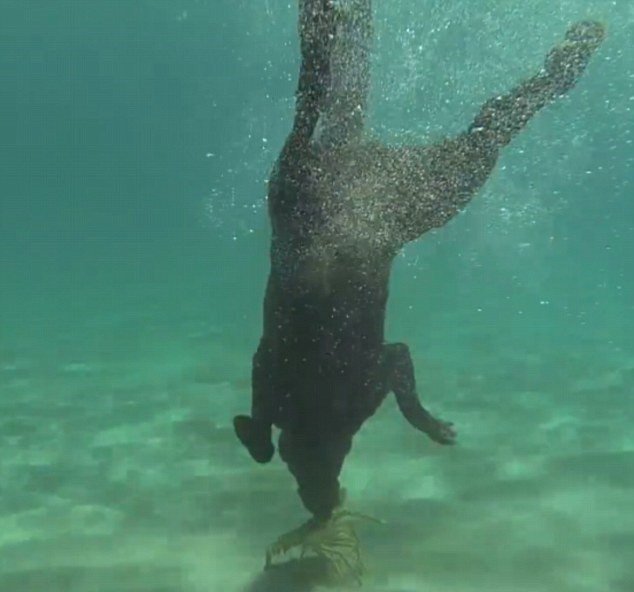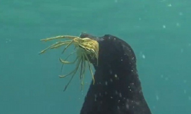 图为接到主人命令后,莉拉潜入水中抓龙虾。