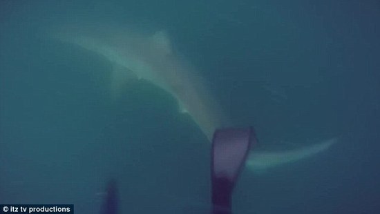 击退鲨鱼后,男子迅速游出水面,回头一看,鲨鱼又离他很近,就在脚的正下方,他觉得鲨鱼一直尾随他。