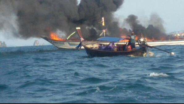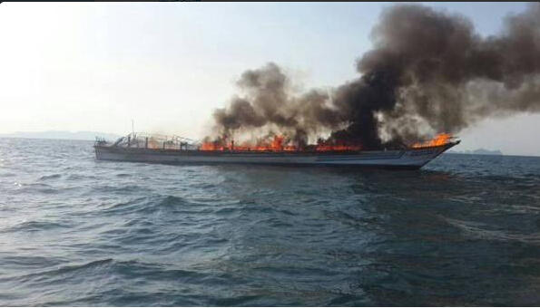 据美联社4月8日发自曼谷的报道,警察颂蓬说,甲米和普吉是泰国最受欢迎的两大旅游胜地。他说,有一名12岁的西方男孩失踪,但是应该被另外一艘前往普吉的船救起来了。营救人员、包括krabi水警所摄照片显示,起火船只下沉前已燃烧至吃水线。