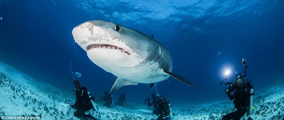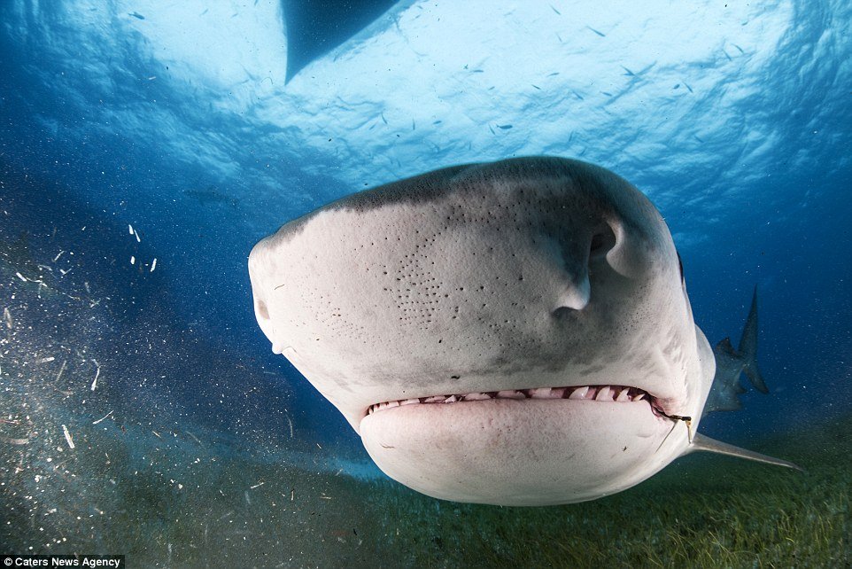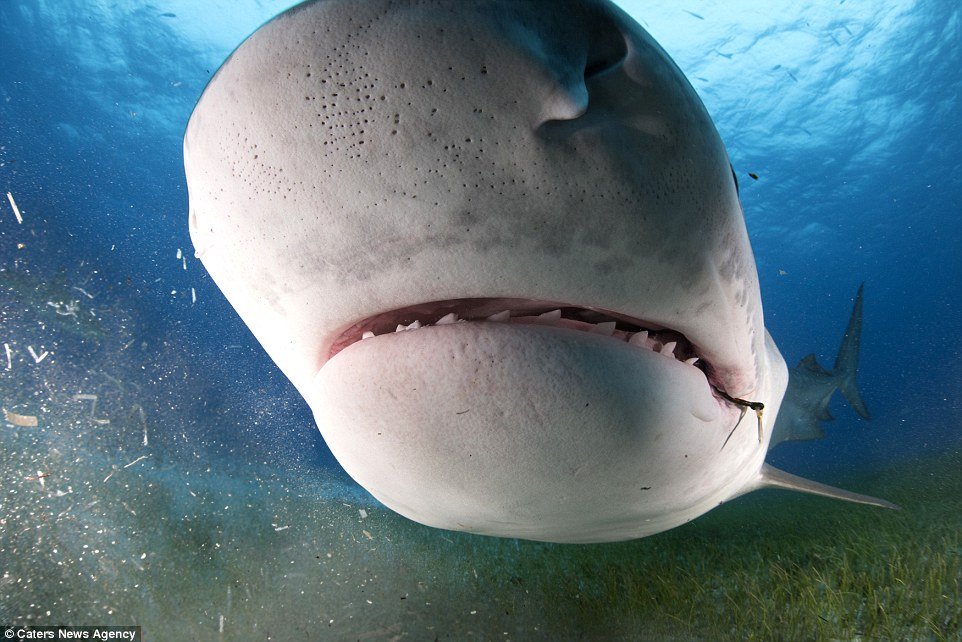 从图片中可以看到,虎鲨离摄影师只有咫尺之遥,危险系数可见一斑。