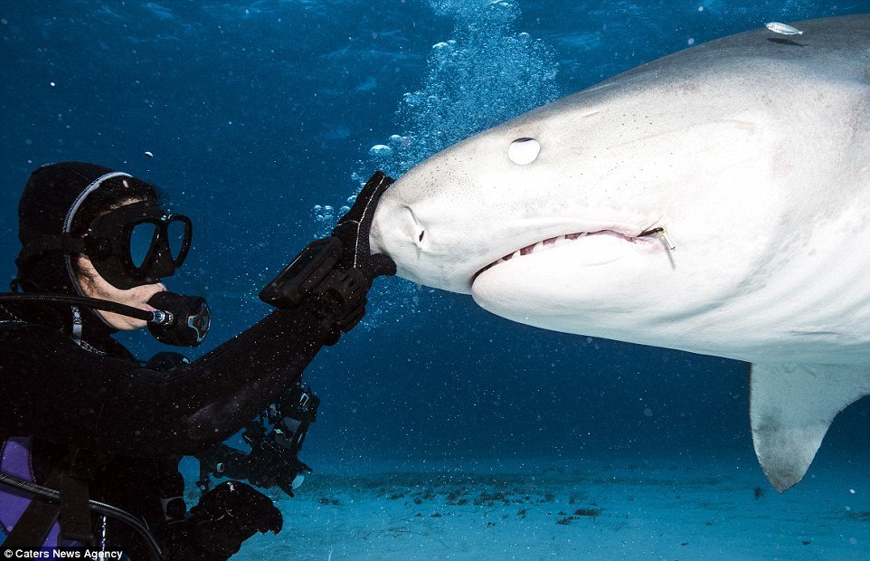 图中显示了摄影师与虎鲨的亲密举动。摄影师Adam Hanlon表示,虎鲨似乎很配合他们的拍摄,它好像知道“规矩”一样,不要袭击人类。