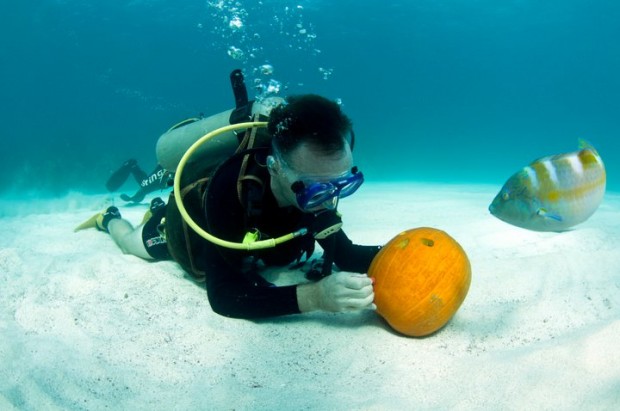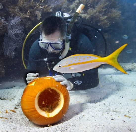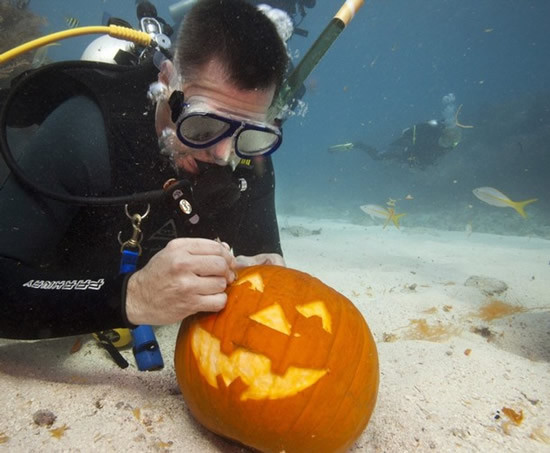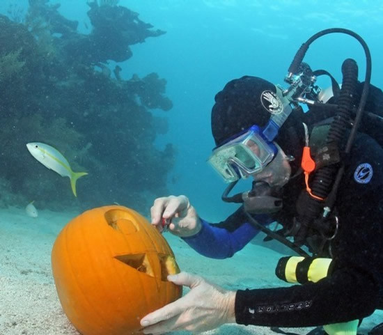 Happy Underwater Halloween,今天全世界的潜水员在忙什么?Wh?是要带南瓜下水吗?Yes,水下雕南瓜!雕南瓜!雕南瓜!雕南瓜!还是欢乐的雕南瓜!那些呆萌有爱的南瓜兄还有更好玩的:来一场特别的水下Hllwee大趴吧,rkrre!