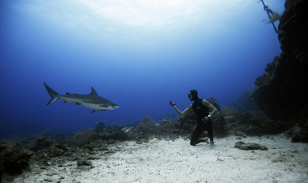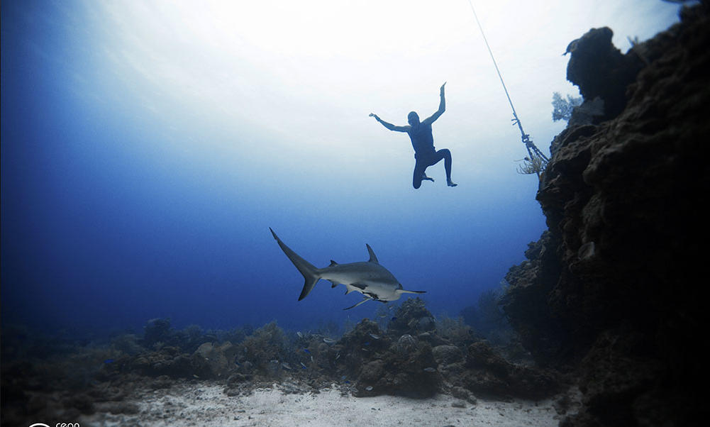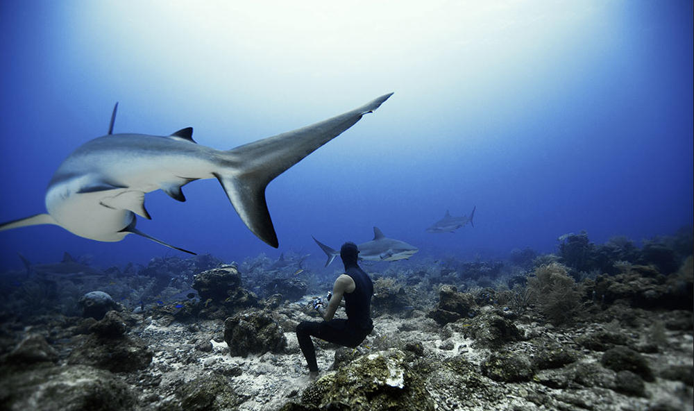 在与加勒比礁鲨一番共舞之后,尤西比奥坐在海中礁石上稍作休息。一条礁鲨仍意犹未尽地在他周围游动,似乎想再度与他一同游玩。