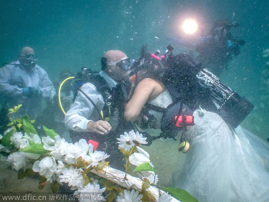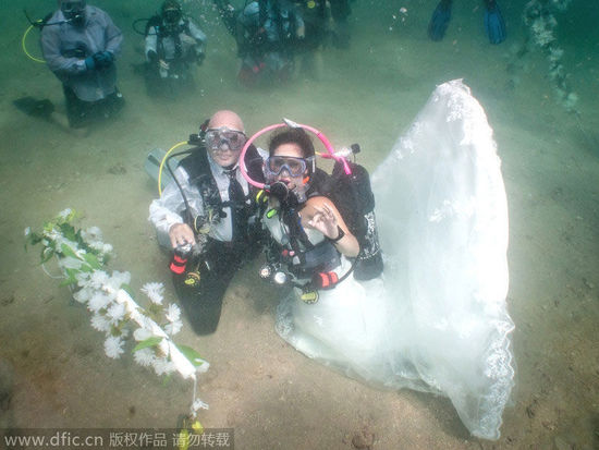 中国日报网8月11日电(欧叶) 综合外媒报道,美国佛罗里达州劳德代尔堡,52岁的比尔(Bill Frenier)和32岁的莉丝贝特(Lizbeth Espejo Frenier)是一对疯狂的潜水爱好者,于是他们决定在大西洋下举办婚礼。这对具有冒险精神的美国夫妇,新娘身披婚纱,新郎身着礼服,在30英尺(约9米)深的水下结为夫妇。婚礼是由一名身着潜水装备的治安法官主持,夫妇俩的亲友也一同见证了这个浪漫的过程。